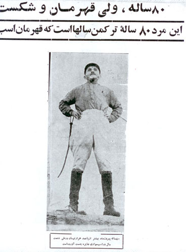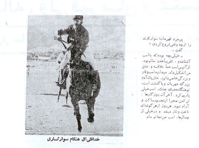 مرحوم خداقلی قهرمان شکست ناپذیر میادین سوارکاری ایران بود تا پایان عمرش ، حتی در سن 70 سالگی در تهران ، گنبد قابوس و بندر ترکمن به چالاکی یک نوجوان در مسابقات اسب دوانی شرکت می کرد و اغلب در کورس ها ، گوی سبقت را از دیگر چابکسواران می ربود. در مطبوعات آن زمان طی سالهای 1331 تا 1352 بعنوان " پیر مرد ترکمن ، قهرمان میدانهای اسبدوانی ایران " منعکس شده بود.